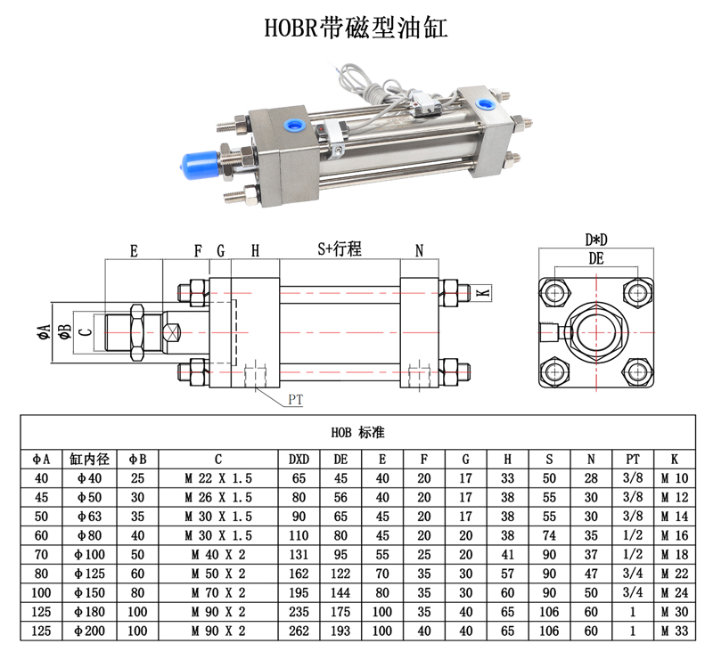 HOB-R磁性油缸,采用磁性开关,活塞加入磁环,灵敏控制导向性,使操作性更加便捷。